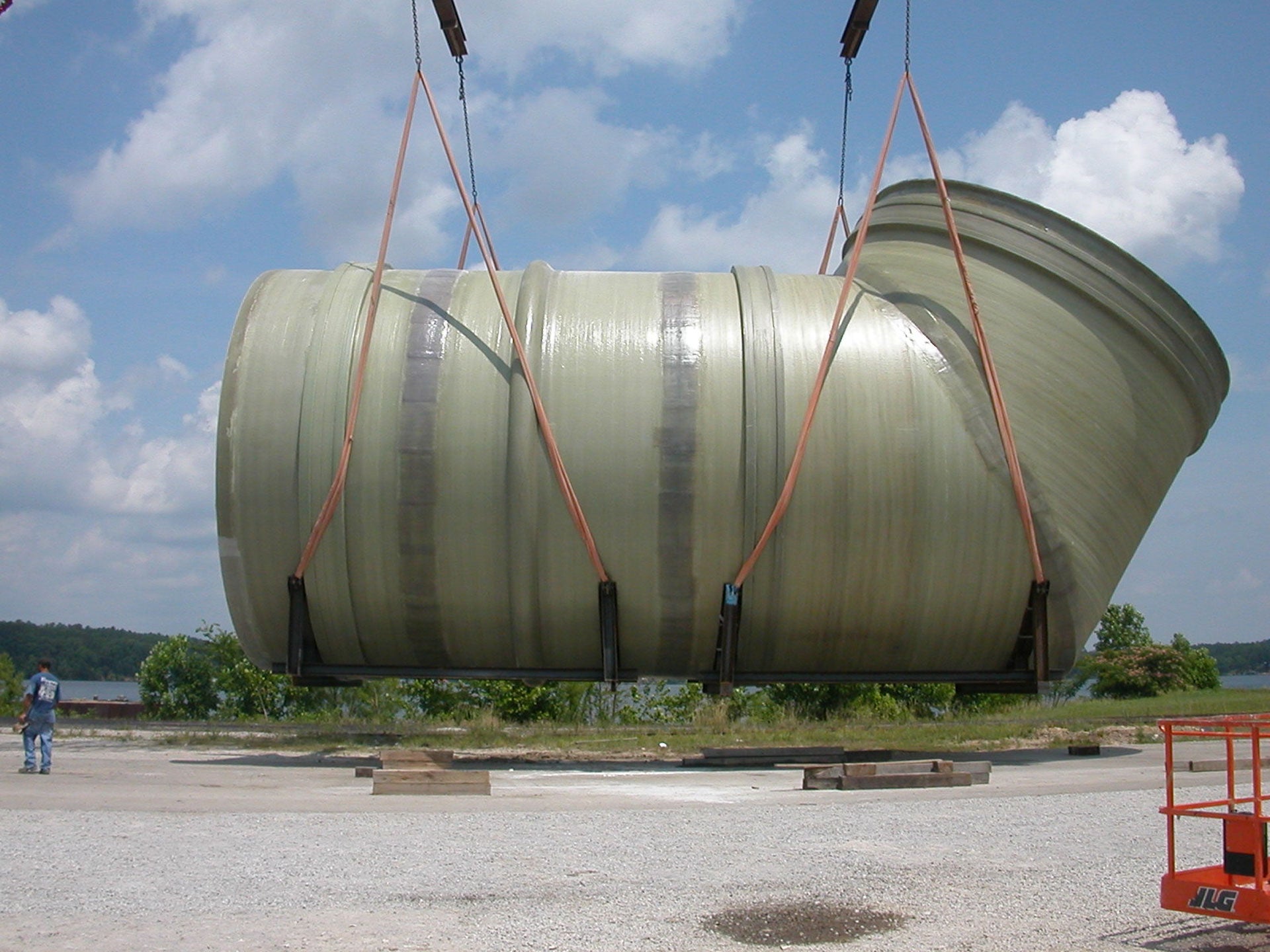 Fiberglass ducting being held up by ropes, hovering over ground