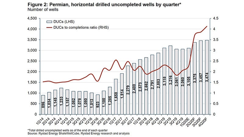 By Q4 2020, only one out of five wells drilled will be completed. Rystad forecasts a 10% increase in DUCs contributed by publicly traded companies and a 16% increase by private operators.