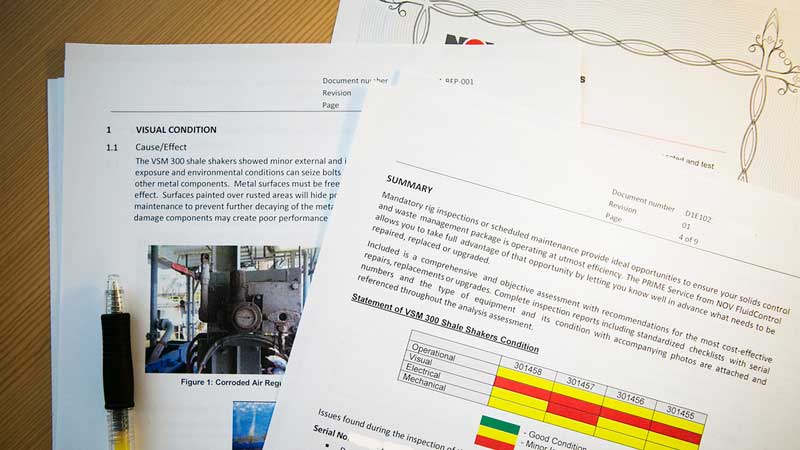 During a 3- to 14-day inspection, NOV assesses the working performance of solids-control, fluid-processing, and waste-management systems and makes recommendations to optimize the equipment. Contractual requirements for equipment recertification are also examined so that time won’t be lost on such processes later, and a report produced after the inspection details the condition of and, if necessary, improvements to the equipment. A comprehensive checklist catalogs serial numbers and condition, while detailed photos give customers a closer look at the condition of their equipment, helping them determine if an on-site crew can handle repairs or if they would like an NOV technician to assist.