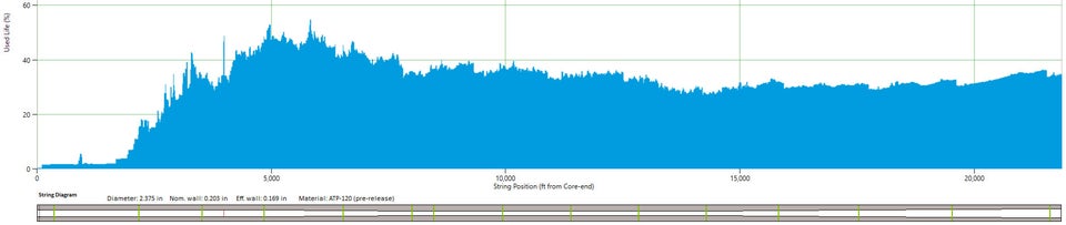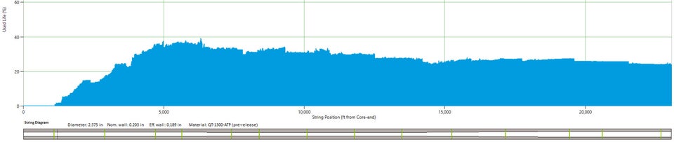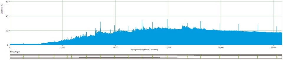 While this theoretical 45% increase in running footage was considerable, it did not prove to be the solution to driving financial performance increases for the operator as the Q&T strings are more expensive than conventional strings. As noted in Table 3, not every service company necessarily saw theoretical results. Fig. 2 is a representative fatigue graph of a Q&T string at retirement.